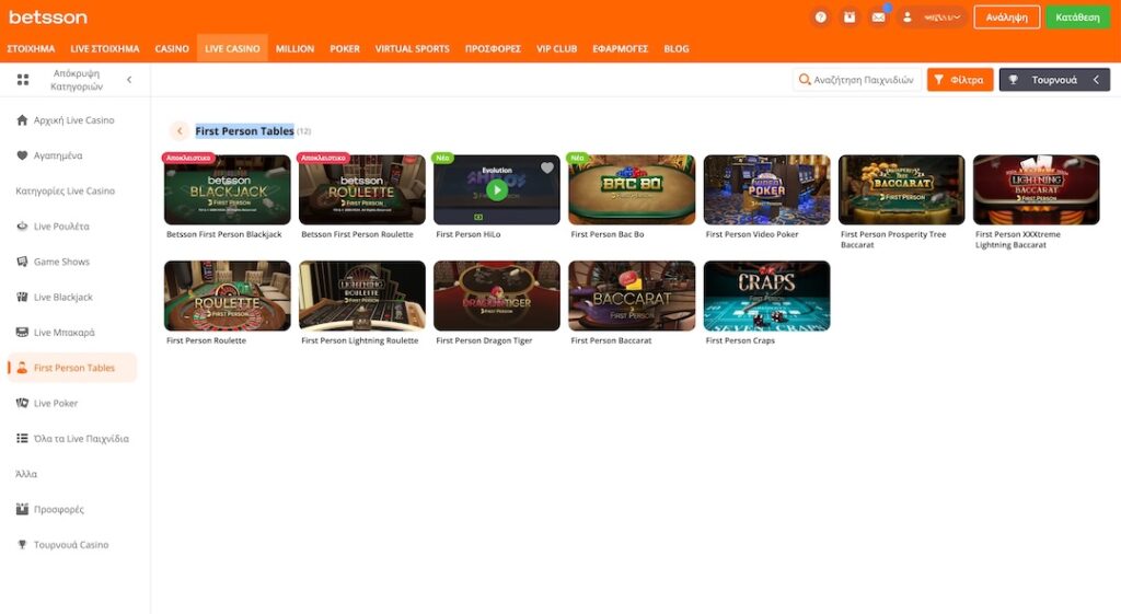 Η Betsson έχει μία πολύ μεγάλη ποικιλία παιχνιδιών First Person, με μερικά από αυτά να μην είναι πολύ γνωστά στο ελληνικό κοινό (όπως πχ τα HiLo, Bac Bo και Craps) με την δημοτικότητά τους να αυξάνεται αργά και σταθερά.