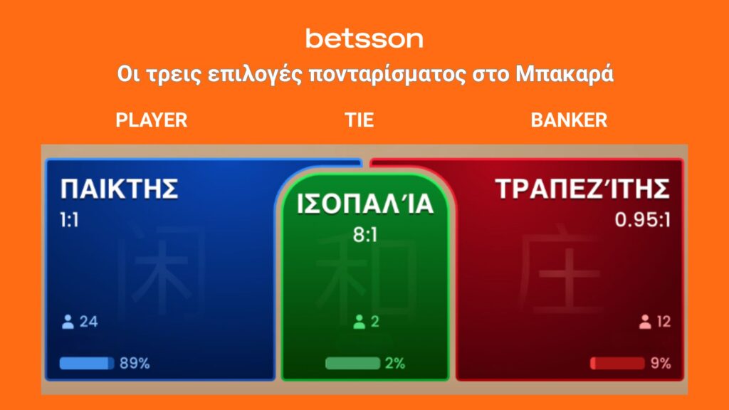 Δεν είναι αληθινοί αντίπαλοι αλλά 2 φανταστικοί αντίπαλοι, ή πιο απλά δύο πλευρές αν θέλετε. Αυτό είναι όλο! Το μόνο που καλείται ο παίκτης της Betsson να κάνει, είναι να μαντέψει ποιος από αυτούς θα νικήσει (θα φτάσει το άθροισμα των καρτών του πιο κοντά στο 9) ή αν θα βγουν ισοπαλία (tie).